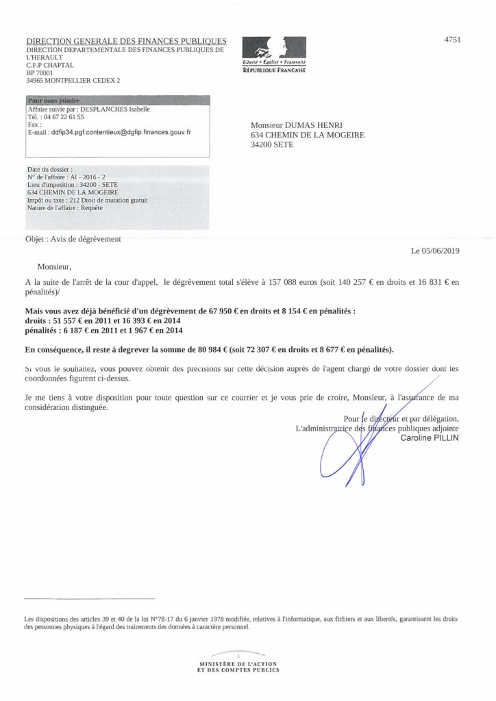Donc vingt ans de procédures, de pression fiscale sur moi et mes enfants à l’époque encore étudiants, vingt ans d’ATD, d’huissiers, de discrédit, de haine, de violence, de harcèlement, de magistrats complices, pour arriver au courrier ci-dessus.