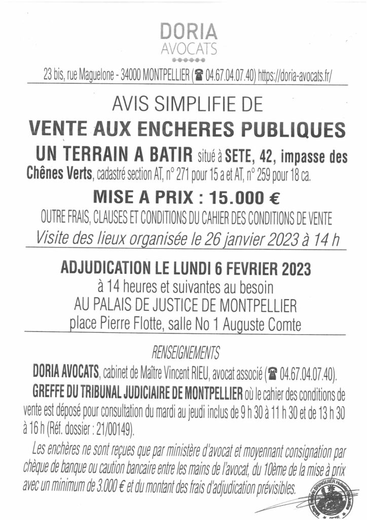 Ceci est l’affiche de la mise en vente d’une partie de mon jardin, qui n’est pas constructible, duquel avec mon chien nous voyons la mer et les Pyrénées, assis sur des restanques plusieurs fois centenaires, auprès d’un olivier peut-être millénaire, entourés de chênes verts protégés.