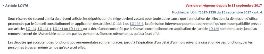 Cet article défini les conditions qui s’imposent en cas de vacance d’un siège de député, tout particulièrement en ce qui concerne le sort de son suppléant.